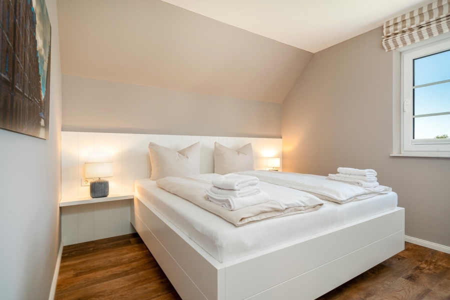 Die Grundrisse bieten mit einem Schlafzimmer und Bad im Erdgeschoss sowie zwei Schlafzimmern und einem weiteren Bad im Obergeschoss ausreichend Platz – auch für den Urlaub mit mehreren Generationen.